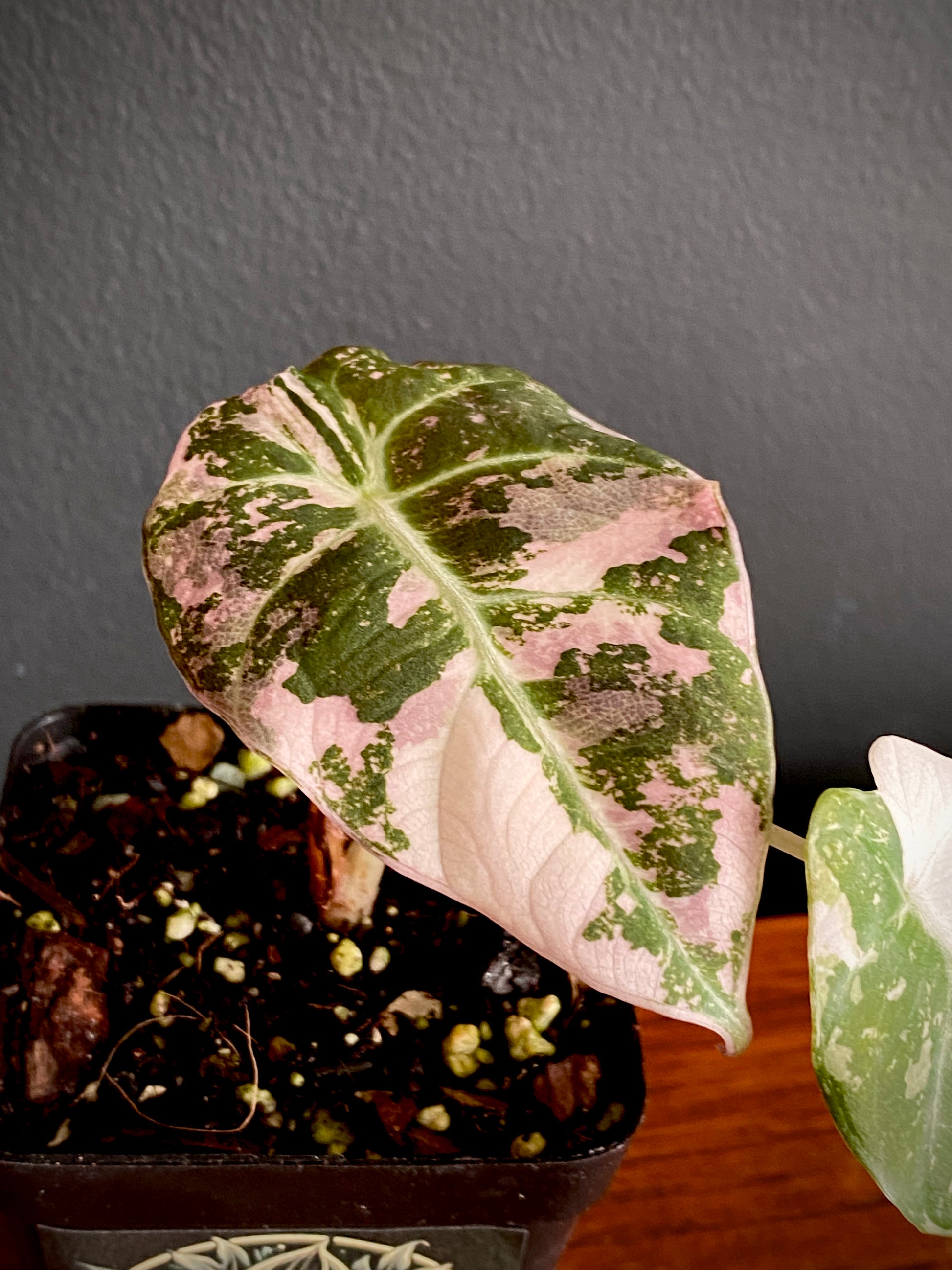 The Alocasia Black Velvet Pink variegata remains one of the most sought after Alocasia varieties available today. Combining the dramatic beauty of deep, velvety almost-black foliage with splashes of pink variegation. A must have for any variegated Alocasia lover.