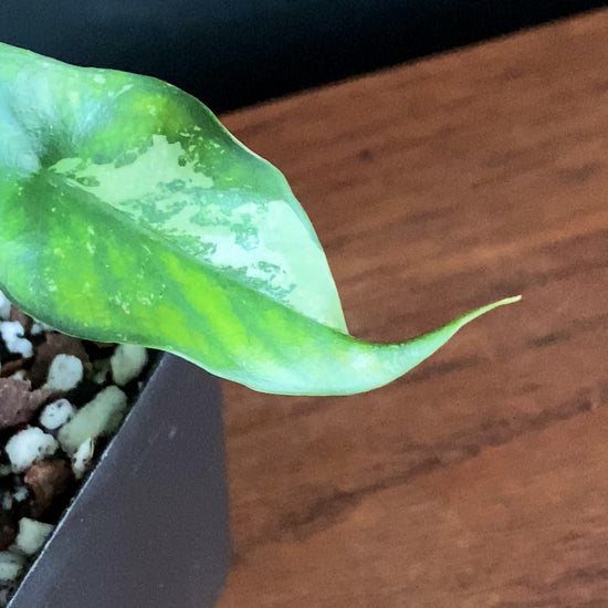 Alocasia Simpo is a hybrid between Lukiwan x Sinuata highly textured leaves of Sinuata with the long and striking leaf shape of Lukiwan. This Albo variegated type provides an extra layer of beauty, rarely seen in the UK and sure to be a standout in your collection. This is a vigorously growing, yet compact variegated Alocasia that puts out leaves quickly.