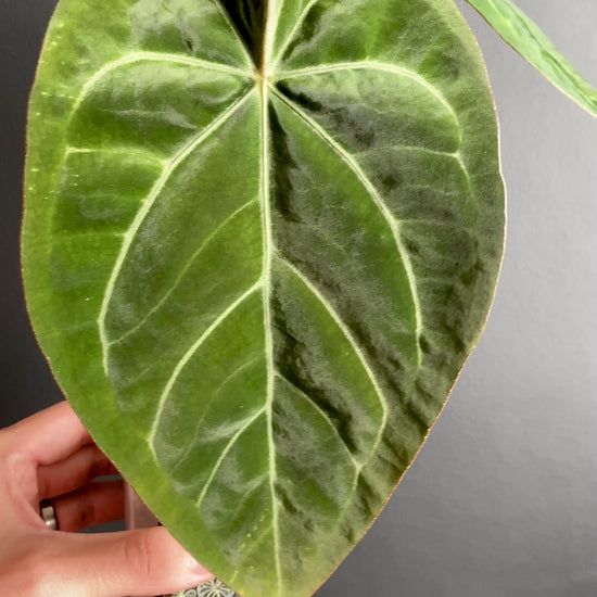 Anthurium Magnificum X Forgetii is a beautifully balanced hybrid showing the prominent green veins and large velvety leaves of magnificum with the fused sinus of forgetii.