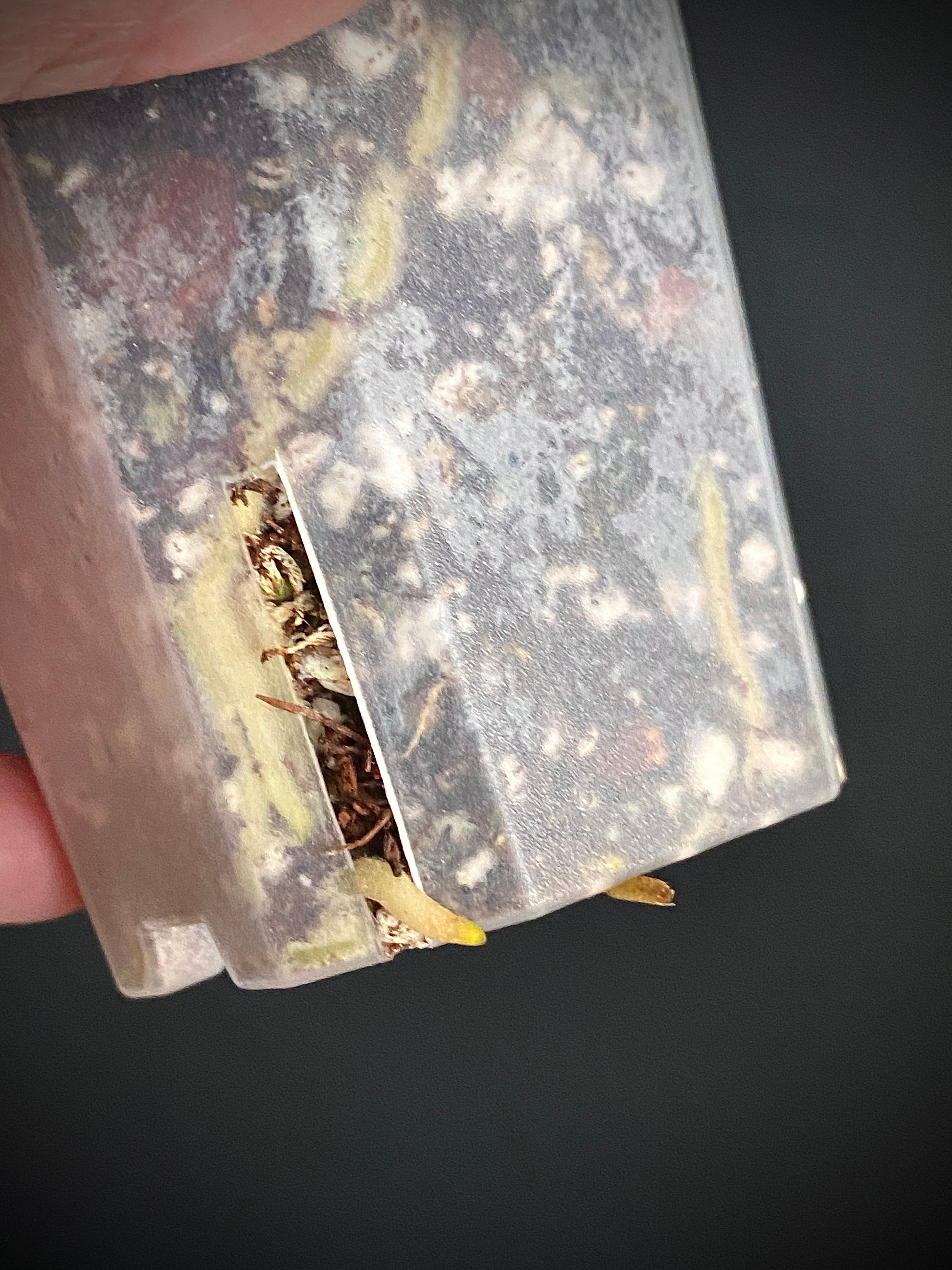 This variegated Anthurium Goliath (x self) has stunning deep red emergents splashed with almost black patterns of variegation which eventually develops into dark green patches across more minty green, well veined leaves. Expected to take on the classic large, dark, velvet Goliath leaf character through maturity.