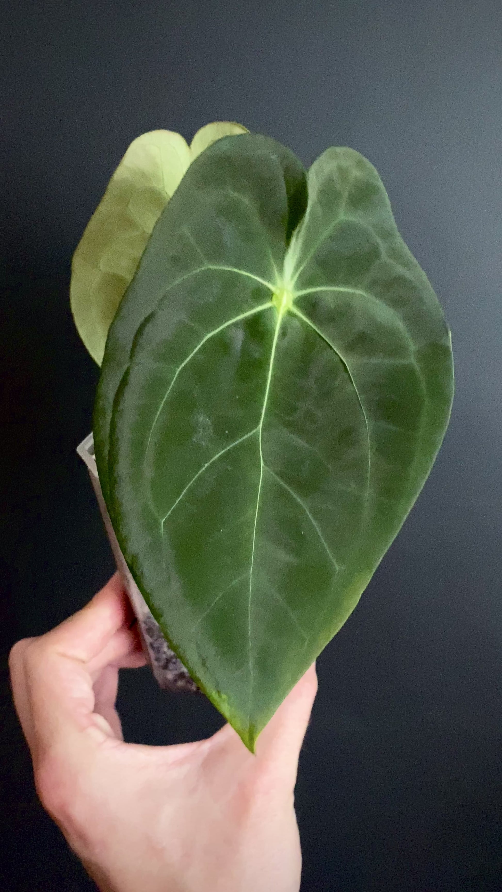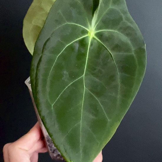 Anthurium papillaminum X forgetii dark form is a hybrid between the dark, velvet and lobed leaf of the papillaminum with the even darker, minimally veined leaves of Forgetii dark form. This stunning hybrid retains its papillaminum shape and velvet sheen with a fused sinus from Forgetii.