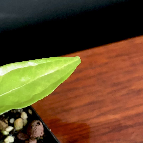 The Anthurium polyschistum is an unusual palmate aroid plant with a climbing habit. Its palm-like leaves show a distinct ruffled edge and will increase in size and number as the plant matures. This is an established propagation (clone) from a mature plant.