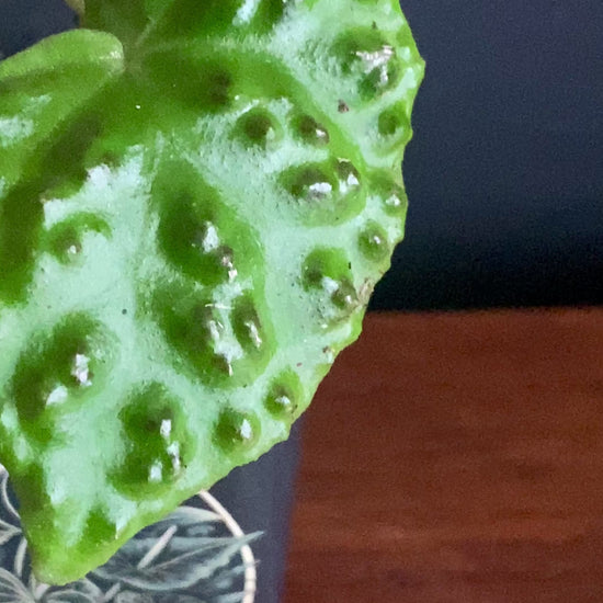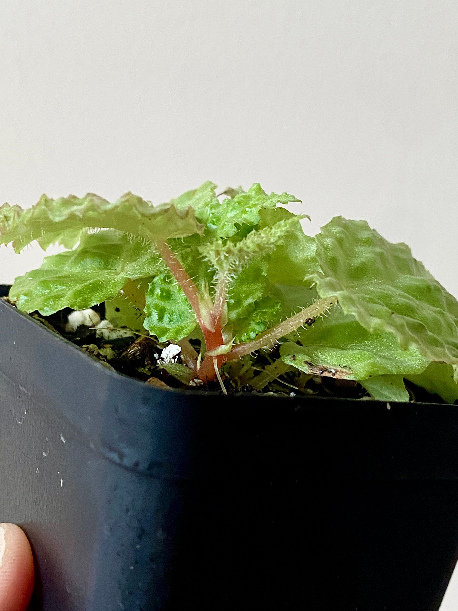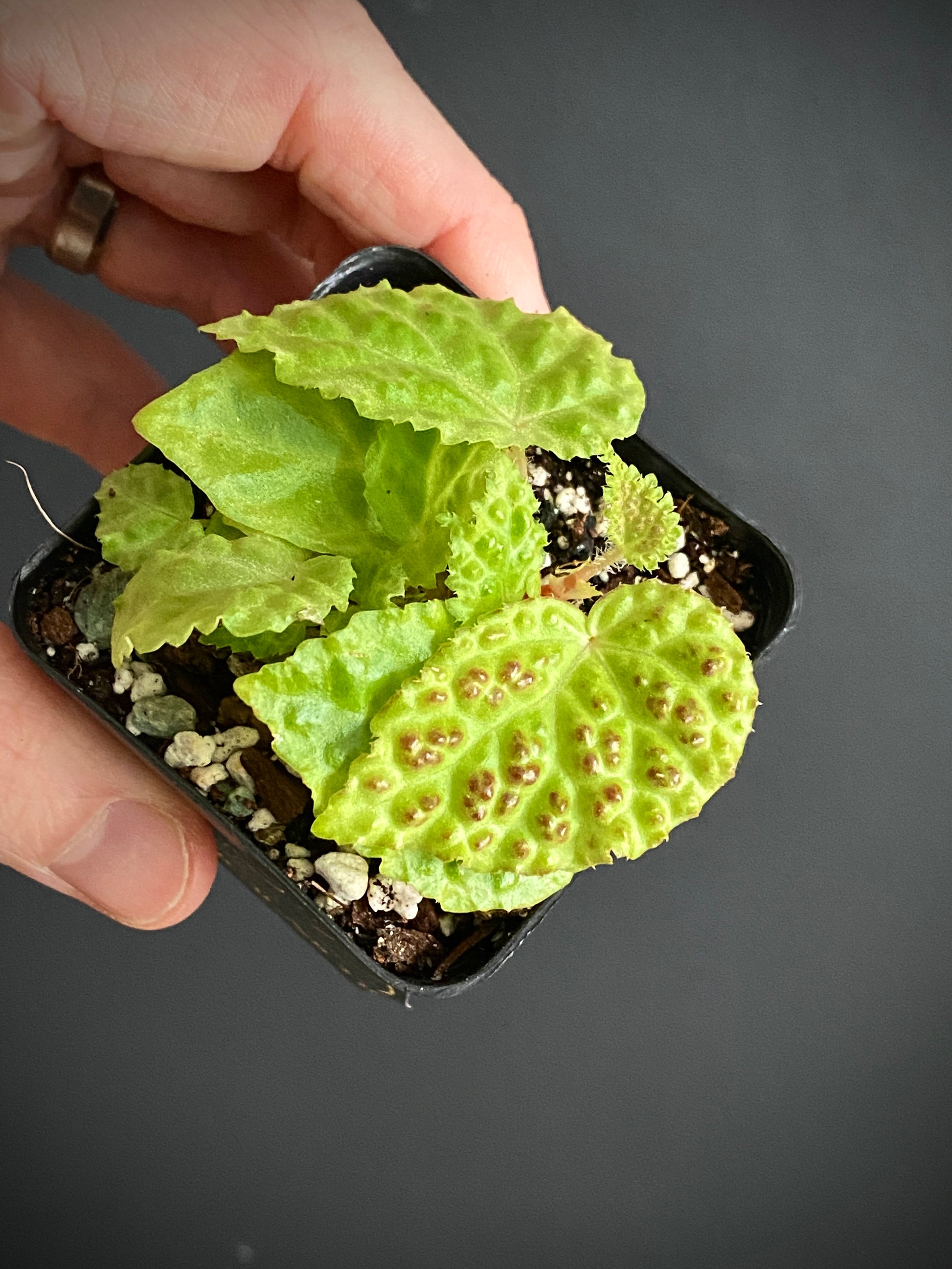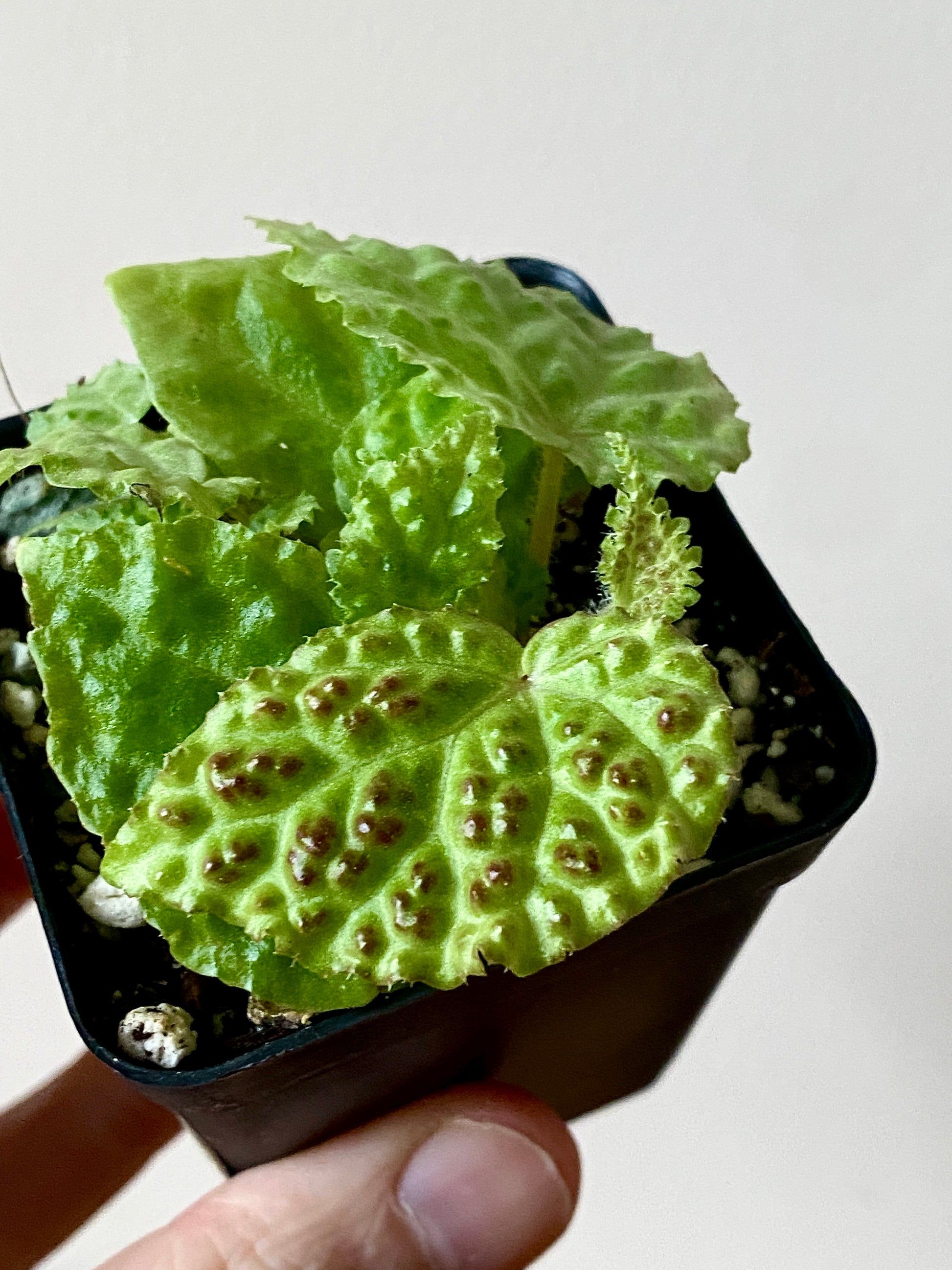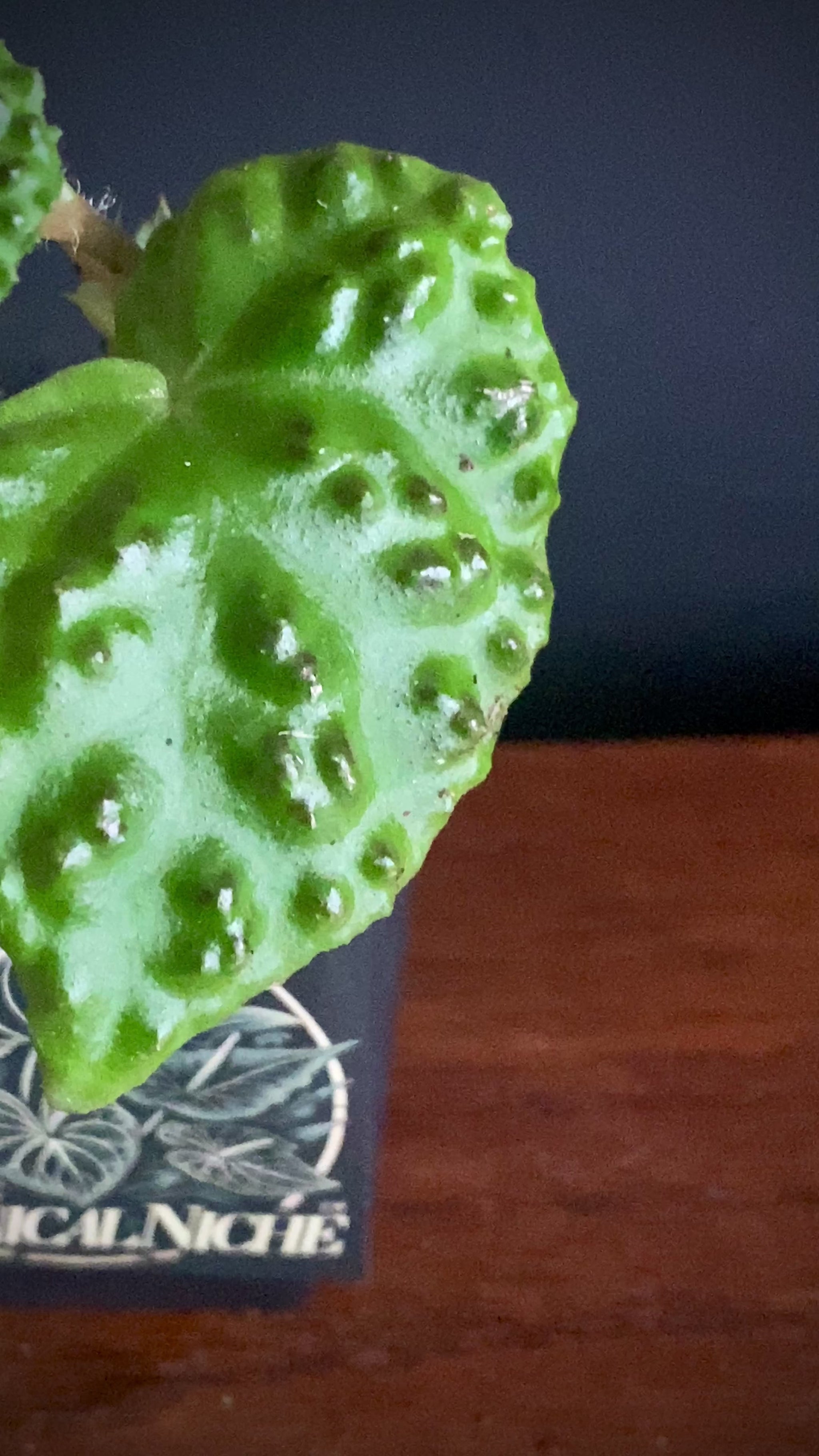 Begonia dracopelta is a rare and highly decorative species native to Borneo, prized for its unique shield-shaped leaves with bullate black texture that resemble dragon scales. The foliage has a rich green tone with darker veining and a textured surface, making it a striking addition to terrariums or exotic plant collections. Due to its specific care needs, B. dracopelta is best suited for terrariums, vivariums, or experienced indoor plant growers.
