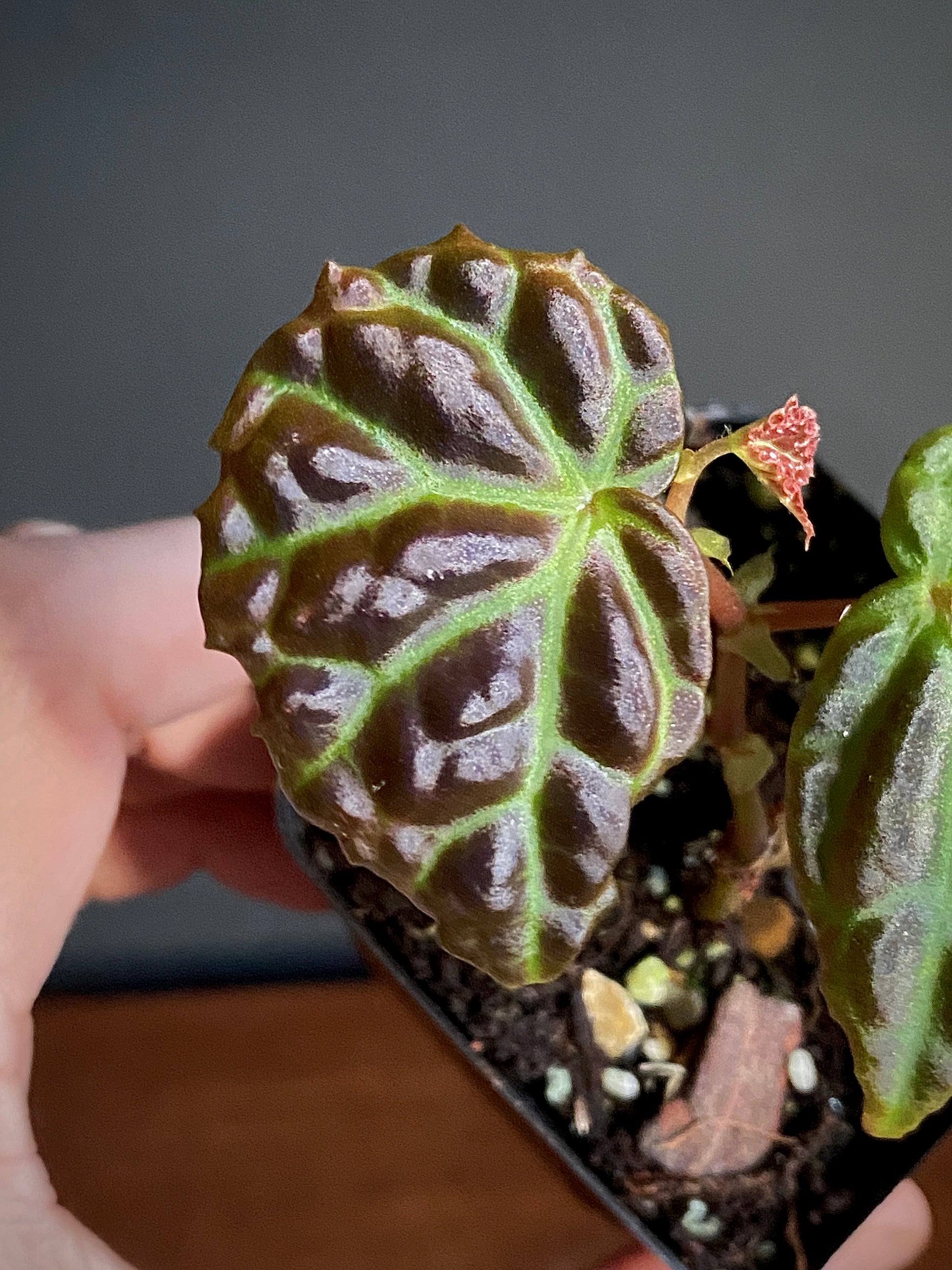 This Begonia hybrid inherits the dragonscale like texture of Dracopelta (even more pronounced than the parent) with the iridescence of Sarawak giving everchanging hues across the bullate and textured leaf surface. A relatively forgiving plant when given the right humidity despite its exotic and otherworldly appearance.